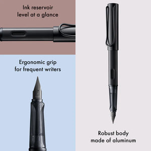 The LAMY AL-star Fountain Pen in Black is the epitome of modern simplicity. Crafted from anodized aluminium with a deep matte finish, this elegant pen embodies strength, balance, and sophistication. Itβs the perfect companion for both professional and creative pursuits β understated, yet undeniably striking.